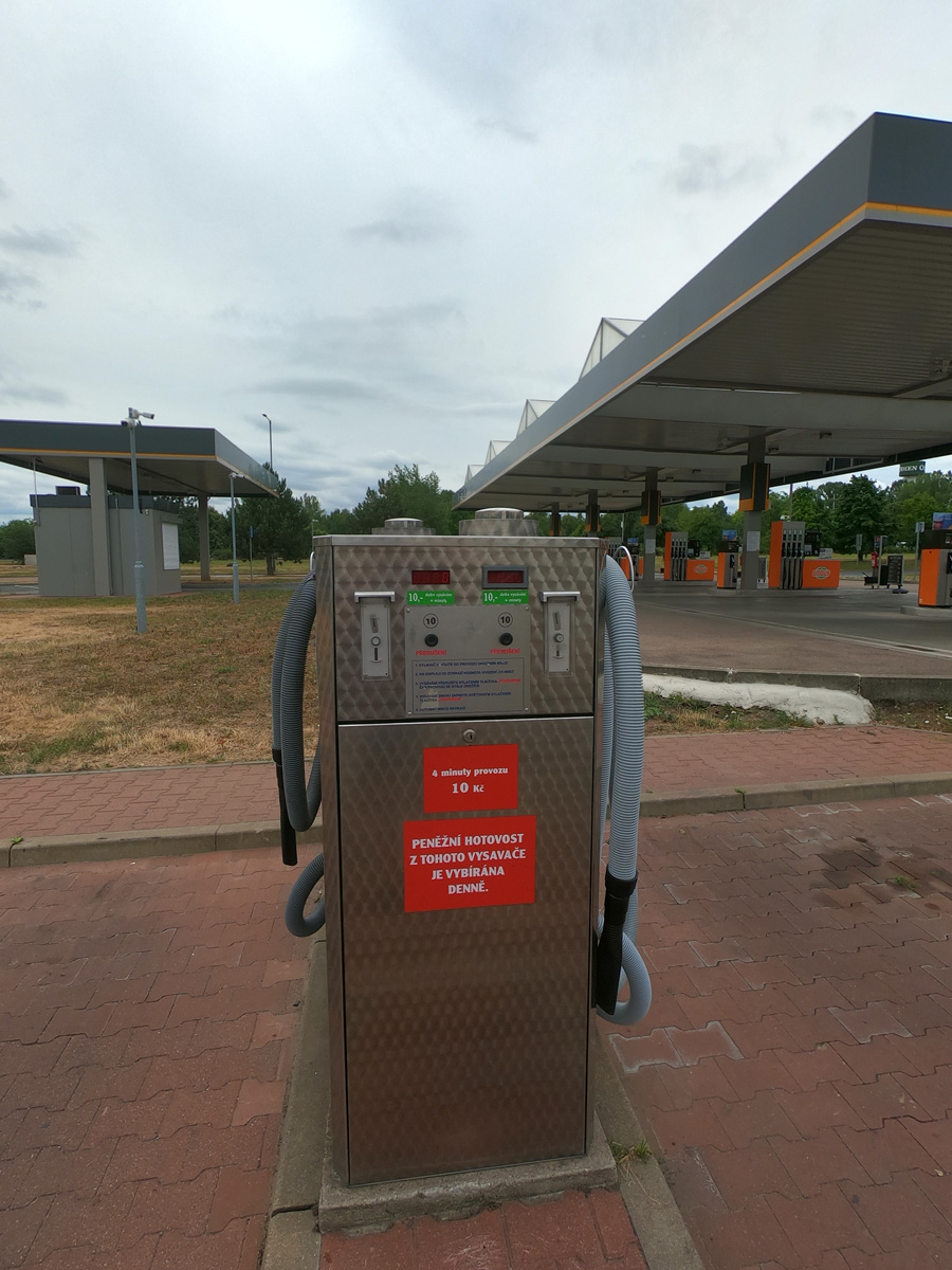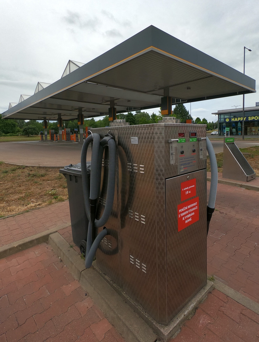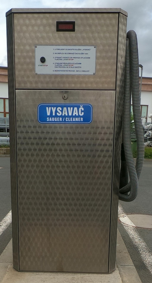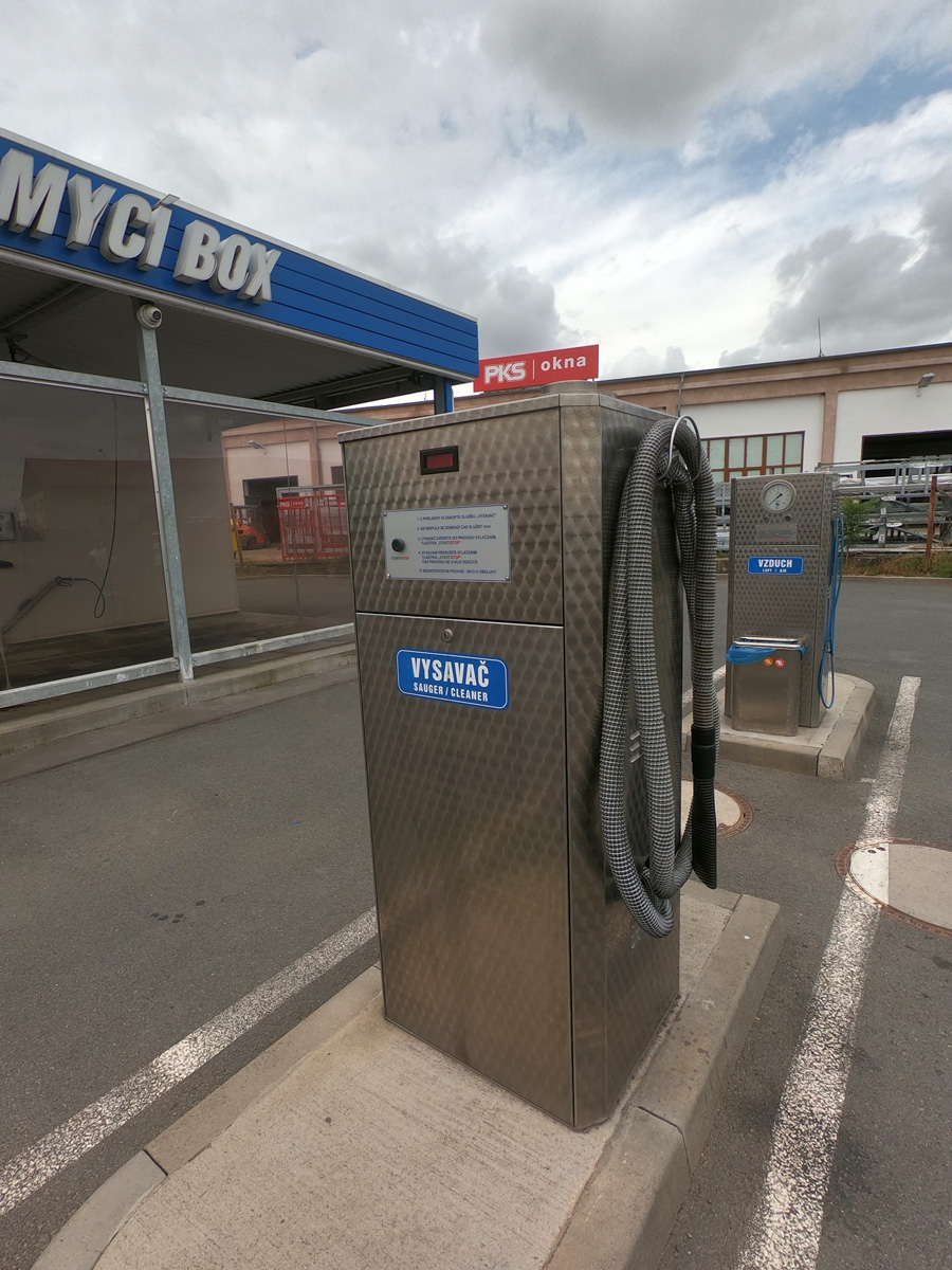 Zařízení tvoří kompaktní skříň z nerez oceli, která je osazena mincovním automatem, displejem, sací vývěvou s odlehčovací klapkou a flexibilním uchycením sací hadice, které umožňuje při vysávání pohodlnou manipulaci se sací hubicí. Připojení hadice k vysavači i sací hubice mají otočné koncovky a tak nedochází k zamotání. Dále je zde osazeno zařízení s kompresorem a řídícím systémem s ovládáním pro huštění pneumatik.