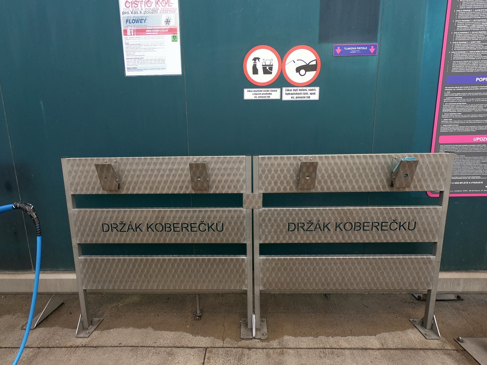 Rám umývání koberečků je určen pro samoobslužné manuální umývání koberců z interiérů osobních, nákladních automobilů, autobusů a jiné dopravní techniky. Konstrukční řešení umožňuje jeho umístění na volných i krytých plochách u ručního mytí autoumýváren. Výrobek je vyroben z nerezové oceli a opatřen dvěma svorkami na uchycení koberečku. Svorky jsou připevněny 3ks šroubů.