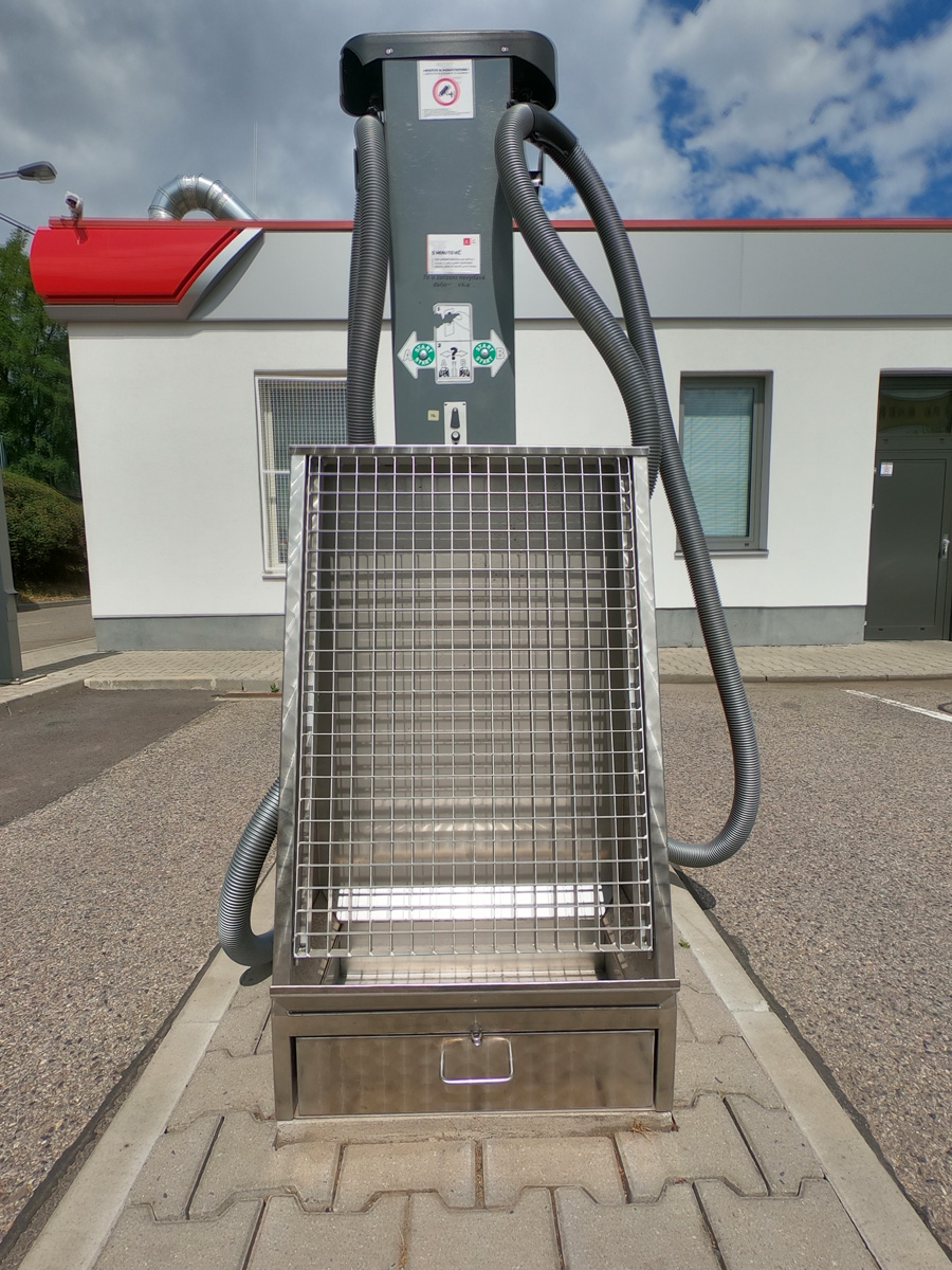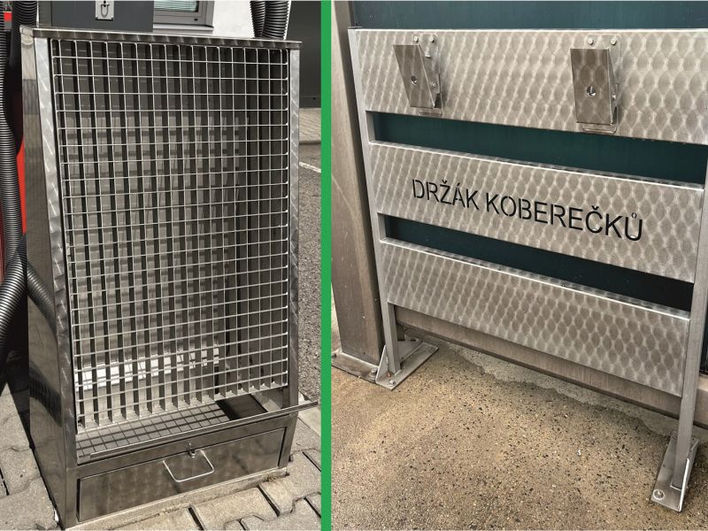 Klepač koberců je určen pro samoobslužné manuální vyklepávání koberců z interiérů osobních, nákladních automobilů, autobusů a jiné dopravní techniky. Konstrukční řešení umožňuje jeho umístění na volných i krytých plochách u čerpacích stanic PHM, v dopravních společnostech, u autoumýváren, na parkovištích apod.