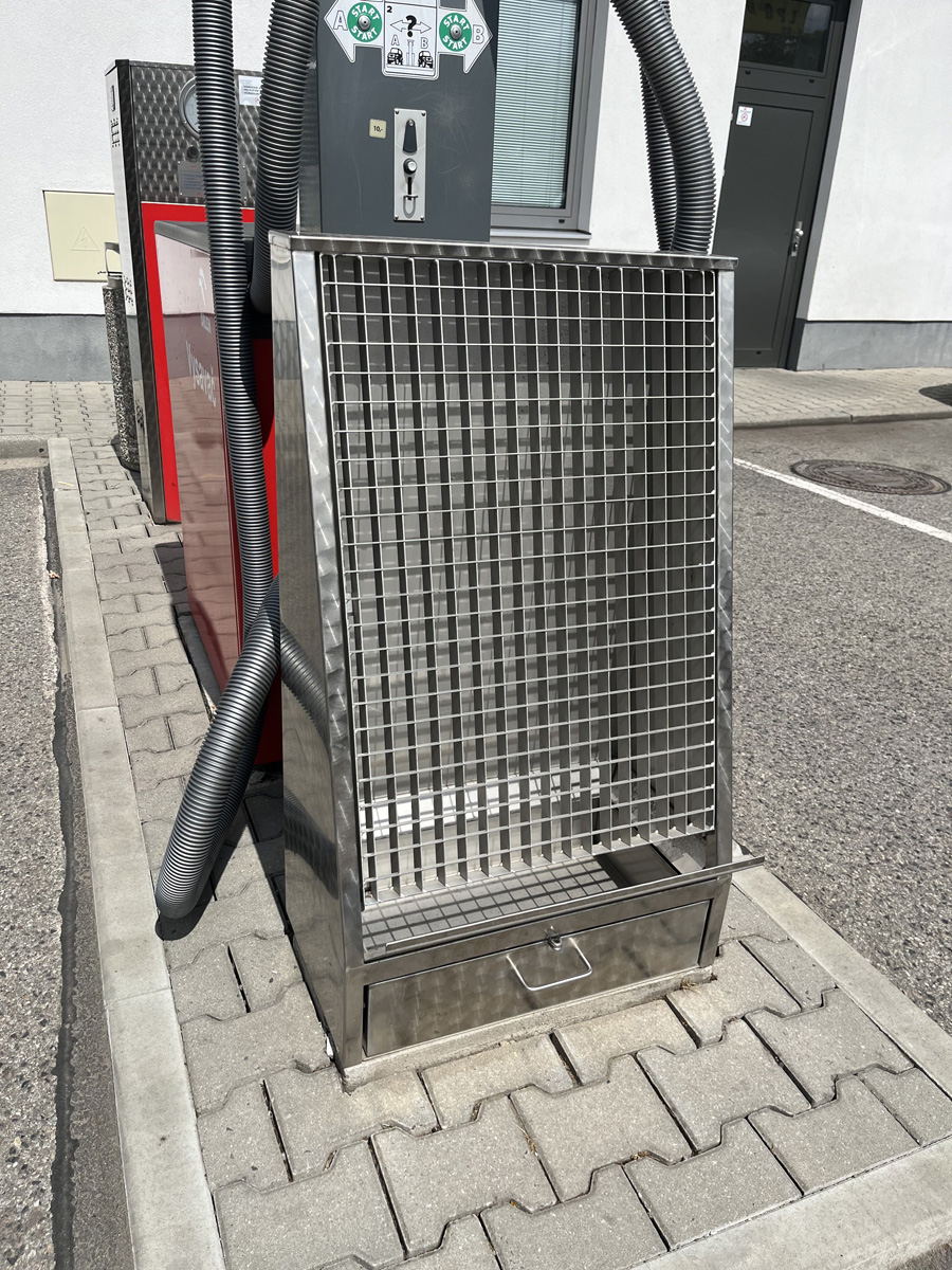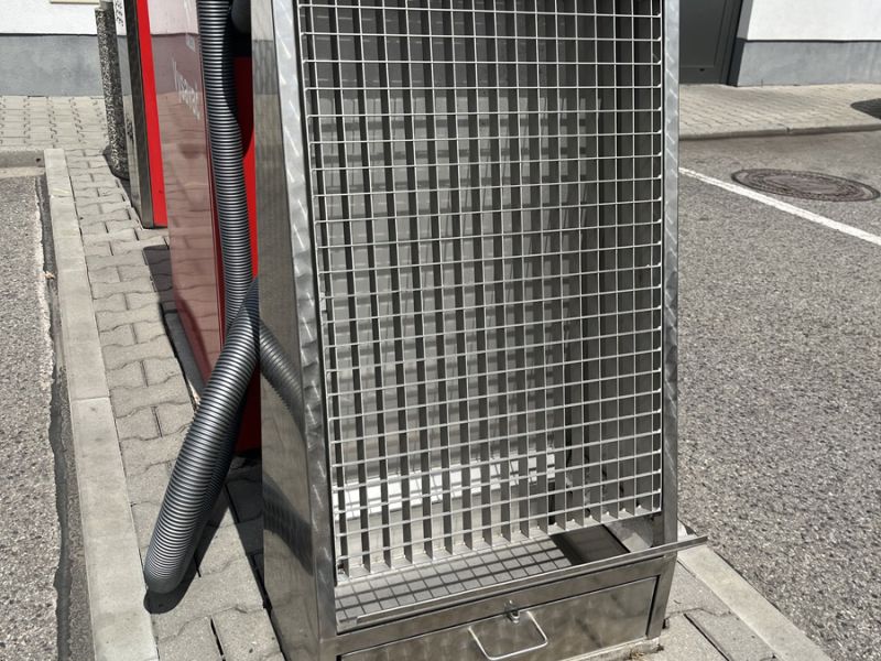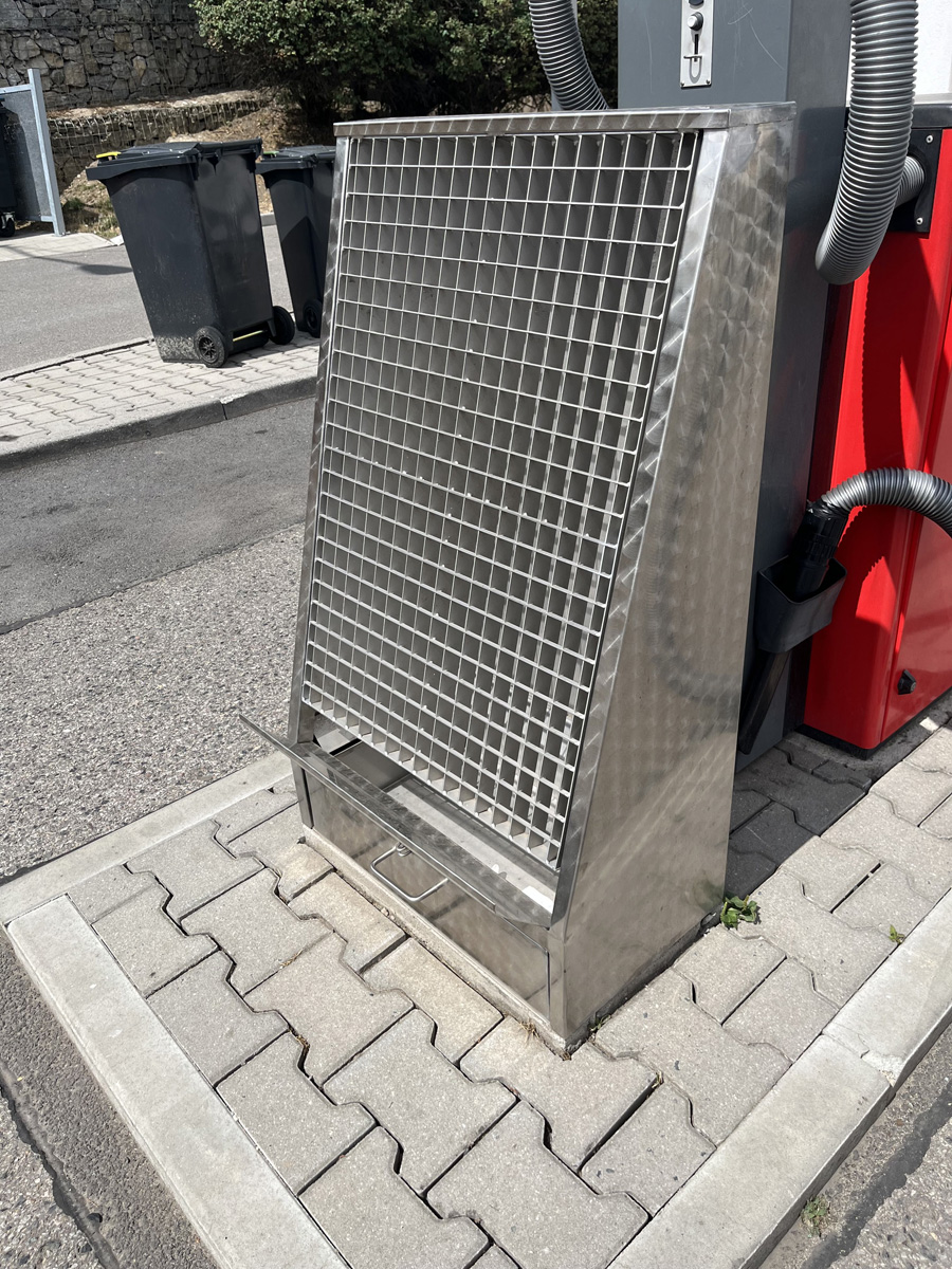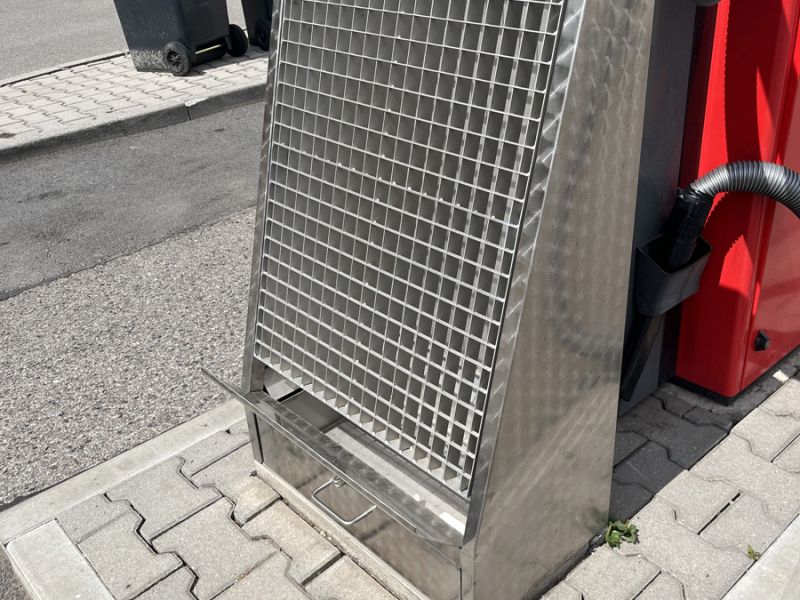 Výrobek tvoří kompaktní skříň z nerez oceli, která je osazena čelním nerezovým roštem, nerezovou sypovou lištou a nerezovým šuplíkem na smetí s ouškem, které umožňuje jeho zamykání visacím zámkem.